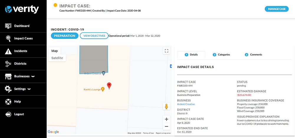 The top of the Impact Case page displays the case status (indicated by a colored dot) with the case number, who created the case, the date of the case, the Manage Case button, the Incident Stage, the View Objectives button, the Operational Period, the business map, and the Impact Case Details.